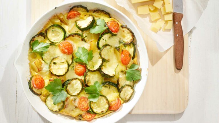 Bate los huevos con la leche y sazónalos. Corta el Emmentaler AOP Bio en dados pequeños. Añade el queso y la mezcla a la verdura. Mete la sartén en el horno a 200º en la altura media y hornea durante 15-20 minutos. Puedes servir la tortilla caliente o fría.