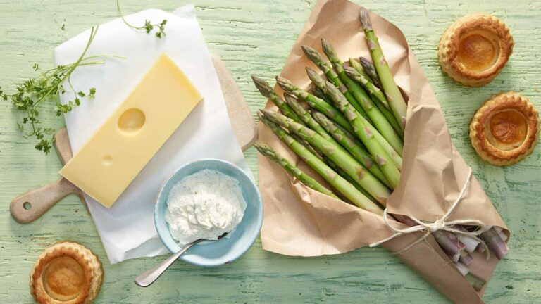 Empieza rallando el queso Emmentaler AOP (D.O.P.) con un rallador fino. Después pela los espárragos por el tercio inferior y córtalos en trozos de 3 cm de largo. Incorpora los espárragos cortados en el caldo y cuécelos a fuego lento y tapados durante unos 10 minutos, hasta que estén blandos.
