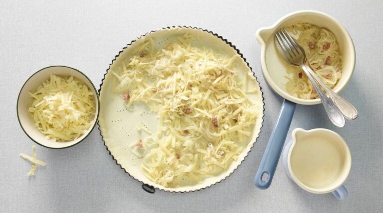Garnir le moule de pâte à gâteau. Piquer le fond avec une fourchette. Répartir les oignons et l’Emmentaler AOP sur le fond de pâte. Verser le battu par-dessus. Faire cuire au four environ 40 minutes à 220 °C sur le gradin inférieur.