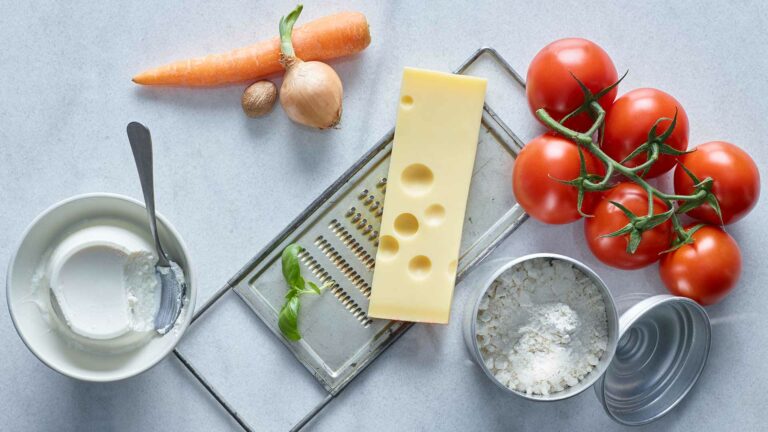 «L’Emmentaler AOP affiné en grotte râpé en copeaux fins est parfait pour concocter un cheeseburger «d’homme des cavernes»: dans un petit pain d’épeautre à l’ancienne avec une belle mie aérée, le tout agrémenté d’une tranche de tomate, de quelques oignons grillés et d’une cuillerée de crème fraîche.»