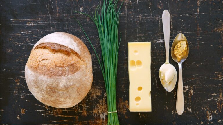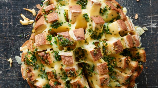 Emmentaler AOP in feine Scheiben und den Schnittlauch in Röllchen schneiden. Butter schmelzen, Schnittlauch und Senf oder Mohnsamen beifügen. Käse in die Broteinschnitte drücken, mit Schnittlauchbutter beträufeln. Das Brot satt in die Alufolie einpacken. In die Mitte des Ofens schieben und 15 Minuten backen. Dann die Alufolie entfernen und nochmals 10 Minuten weiterbacken.