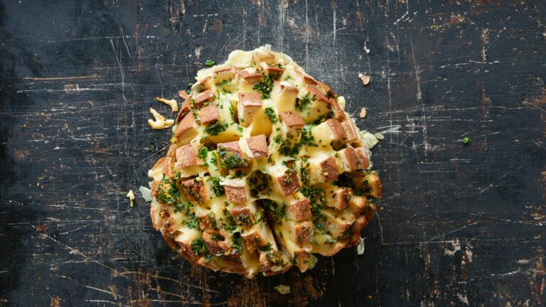 Backofen auf 175 °C vorheizen. Ein gutes Brotmesser ist das A und O. Brot kreuzweise einschneiden, ohne den Boden durchzuschneiden. Auf ein Blech mit Backpapier ein grosses Stück Alufolie (am besten die feste Qualität) legen.