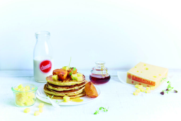Mélangez les jaunes d’œufs avec le lait, ajoutez la farine, la levure et mélangez le tout jusqu’à obtention d’une pâte lisse. Battez les blancs en neige. Incorporez-les dans la pâte et laissez reposer 1/2 heure. Faites chauffer le beurre et le miel dans une poêle à feu moyen. Ajoutez le thym et les abricots coupés en 2. Faites-les dorer pendant 3 mn. Déposez une louche de pâte dans une poêle avec du beurre, ajoutez un peu d’Emmentaler AOP suisse râpé. Dès que des petites bulles apparaissent à la surface, retournez et continuez la cuisson 30 secondes. Servez les pancakes avec les abricots, le sirop d’érable et le thym frais.