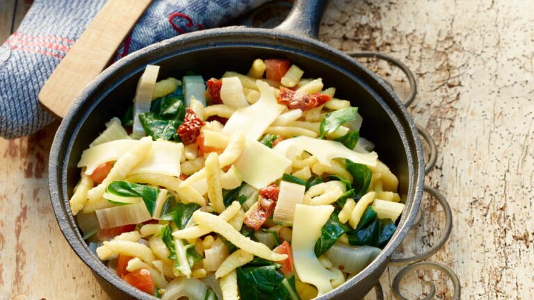 Faire chauffer le beurre à rôtir dans une poêle et y faire revenir les knöpfli 4-5 minutes puis réserver. Faire chauffer l’huile dans la poêle et y faire revenir les tiges de blette et l’oignon 5 minutes. Ajouter les feuilles de blette, les tomates et les tomates séchées et faire revenir 3 minutes à feu vif, saler et poivrer.