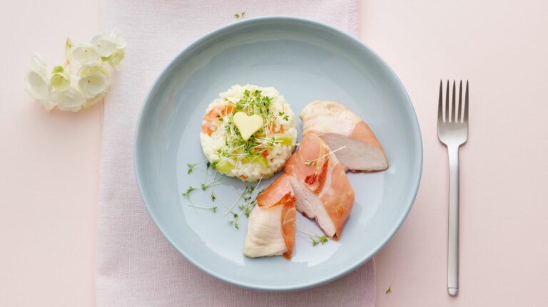 Couper 2 à 3 tranches fines d’Emmentaler AOP. Découper des cœurs à l’aide d’un emporte-pièce. Râper finement le fromage restant. Incorporer le fromage râpé et la crème au risotto. Répartir le cresson sur le risotto, couper les blancs de poulet et décorer avec les cœurs d’Emmentaler.