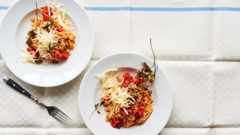Jeter l’eau de cuisson de l’épeautre ou du riz, bien égoutter. Faire chauffer l’huile d’olive et 1 c. s. de beurre. Ajouter l’oignon, le faire suer. Ajouter l’épeautre ou le riz, faire revenir en remuant. Mouiller au vin blanc, faire réduire. Ajouter les tomates au bouillon, faire cuire doucement 50–60 minutes. Ajouter le reste de beurre, couvrir, éloigner la casserole du feu. A couvert, laisser reposer le risotto 5 minutes. Servir avec l’Emmentaler AOP et le reste des tomates rôties.