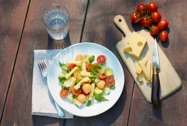 «L’Emmentaler AOP affiné en grotte râpé en copeaux fins est parfait pour concocter un cheeseburger «d’homme des cavernes»: dans un petit pain d’épeautre à l’ancienne avec une belle mie aérée, le tout agrémenté d’une tranche de tomate, de quelques oignons grillés et d’une cuillerée de crème fraîche.»