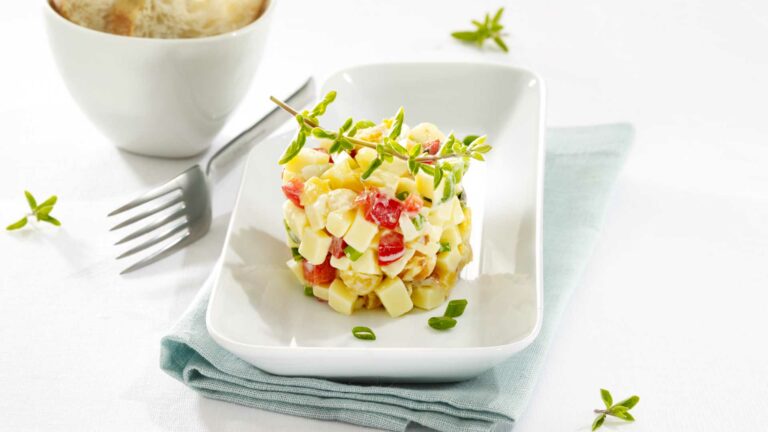 Garnir 4 tasses de film alimentaire et les remplir de tartare de Emmentaler AOP en tassant un peu. Renverser sur les assiettes, retirer la tasse et le film.