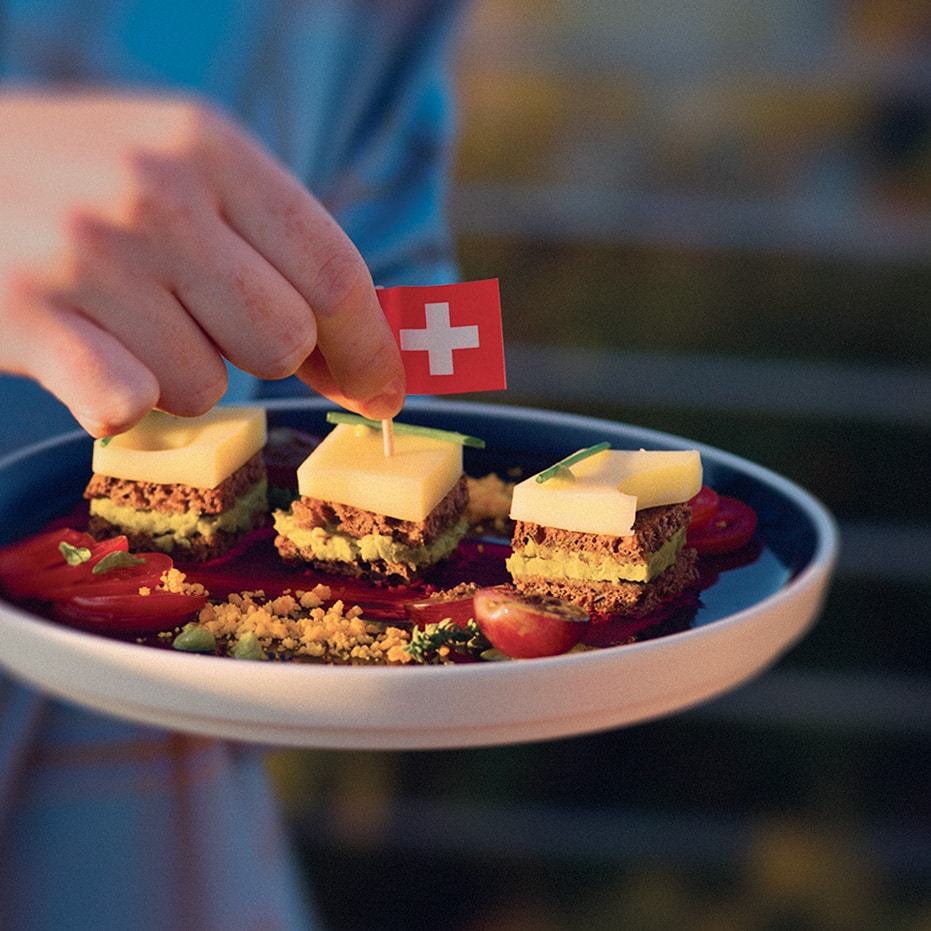 Coupez l’aubergine en dés et faites-la revenir dans une poêle avec de l’huile d’olive extra vierge et une gousse d’ail jusqu’à ce qu’elle ramollisse. Salez et poivrez et terminez la cuisson, puis passez le tout au mixeur pour obtenir une consistance crémeuse. Coupez les betteraves cuites et épluchées en dés, mixez-les en ajoutant 50 ml d’eau chaude, une cuillère d’huile d’olive extra-vierge et une pincée de sel. Faites cuire les œufs dans l’eau bouillante pendant 7/8 minutes jusqu’à ce qu’ils soient durs, écalez-les et gardez uniquement les jaunes cuits. Faites griller deux tranches de pain de seigle dans une poêle et coupez-les en carrés réguliers, composez vos canapés avec du pain de seigle à la base, de la crème d’aubergine, un autre carré de pain et une généreuse tranche d’Emmentaler AOP, pour couronner le tout ! Servez-les sur un lit de crème de betterave, quelques tranches de tomates et le jaune d’œuf dur émietté sur le dessus.