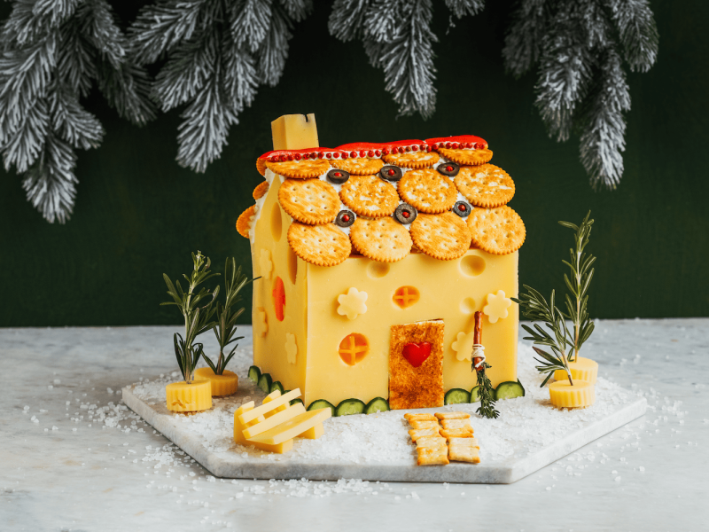 Disponete in cerchio, al centro di una piastra di marmo, sei fette triangolari di Emmentaler DOP in modo che formino un esagono. Ora disponete sopra l’esagono altri sei triangoli leggermente sfasati, in modo da creare una stella.