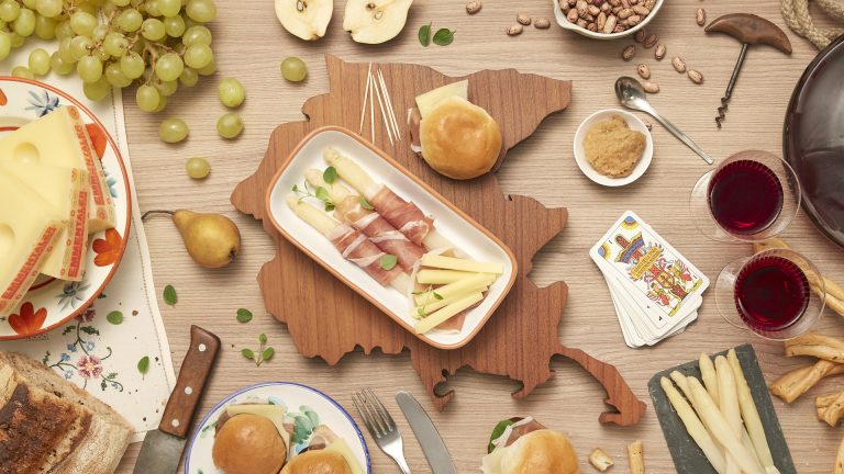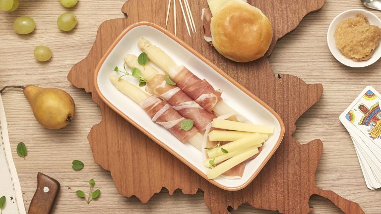 Iniziate cuocendo gli asparagi in acqua bollente  per 10/15 minuti avendo cura di tenere le punte fuori dall’acqua. Quando sono cotti fateli raffreddare e avvolgeteli uno a uno con le fette di prosciutto di San Daniele. Serviteli su di un piatto di portata accompagnati dall’Emmentaler DOP tagliato a fettine sottili. Guarnite con foglioline di maggiorana fresca.