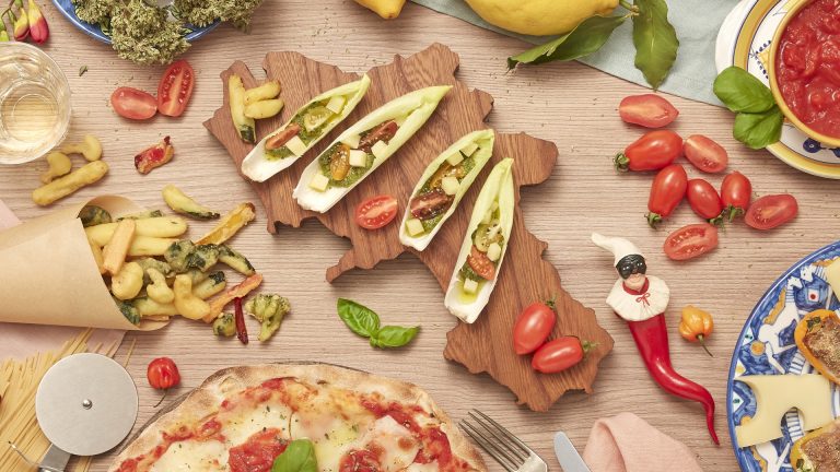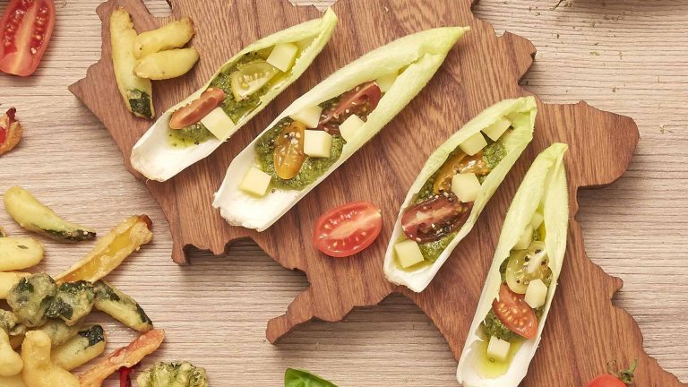 Barchette di insalata belga, pomodorini ed Emmentaler DOP e pesto di basilico