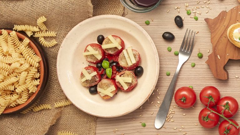 Bocconcini di pomodori gratinati, Emmentaler DOP e olive nere