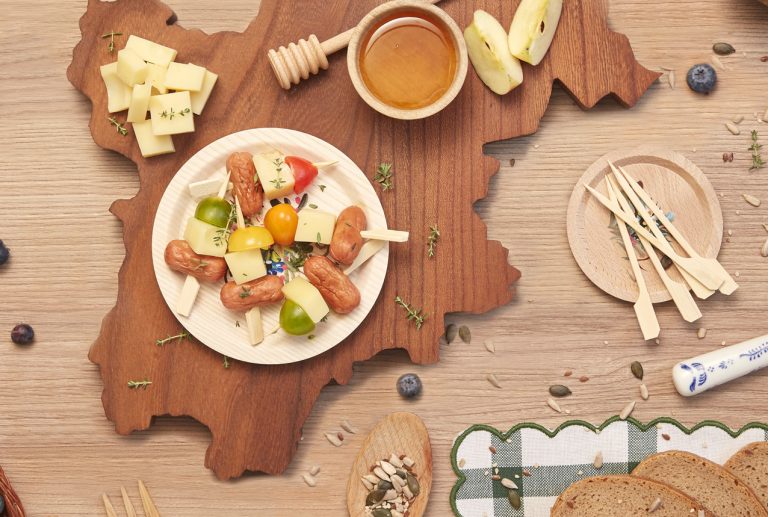 A questo punto, iniziate a montare gli spiedini mettendo su di uno stuzzicante un cubetto di Emmentaler DOP, un würstel e un pomodorino tagliato a metà. Servite su un piatto oppure un tagliere, spolverizzando con foglioline di timo fresco.
