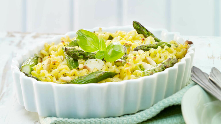 Scolare i fusilli, aggiungere gli asparagi e il composto liquido e mettere il tutto in una teglia per gratin. Spargere sopra i pinoli. Cuocere al centro del forno a 200 gradi per ca. 25 minuti.
