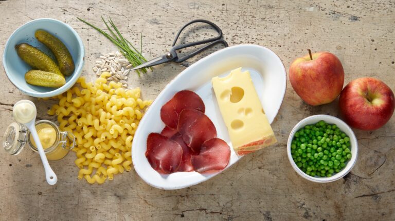 Mischiare la maionese, lo yoghurt e il liquido dei cetriolini sottaceto con sale e pepe per formare una salsa. Tostare i semi di girasole in una padella senza aggiunta di grassi finché non assumono una colorazione dorata. Tagliare le mele in quattro, togliere i semi e tagliarle a pezzetti. Tagliare l’Emmentaler DOP a bastoncini. Tagliare l’erba cipollina finemente. Fare a pezzetti il Mostbröckli.