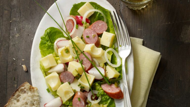 Mischiare l’aceto, l’olio, la senape, sale e pepe per formare una salsa. Tagliare l’Emmentaler DOP Confederato a cubetti di 1-2 cm. Tagliare gli salsicce emmental o cervellate a rotelline. Tagliare i cetriolini sottaceto a cubettini. Tagliare i ravanelli in quattro o in otto in base alle dimensioni. Tagliare la cipolla ad anelli fini. Mescolare tutti gli ingredienti con la salsa. Impiattare l’insalata di formaggio e wurstel con le foglie di insalata. Cospargere con l’erba cipollina tagliata a pezzettini.