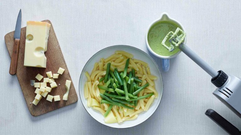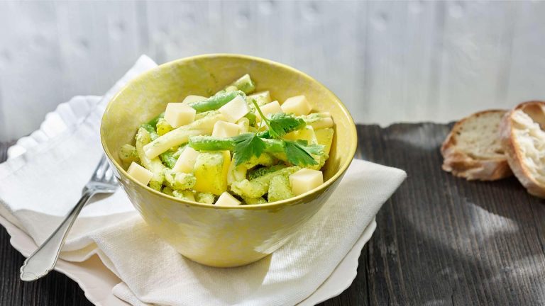 Tagliare l’Emmentaler DOP a cubetti. Aggiungere la salsa a patate, pasta, fagiolini e formaggio e mescolare con cura.