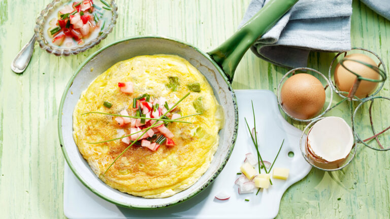 Tagliare l’Emmentaler DOP a cubetti. Separare le chiare d’uovo dai tuorli. Aggiungere i tuorli, gli asparagi, i cubetti di formaggio, lo zafferano, il sale e il pepe e mescolare bene. Montare a neve le chiare d’uovo e aggiungerle al composto contenente i tuorli. Utilizzare il composto per preparare due omelette. A tale scopo, far sciogliere a tale scopo un po’ di burro in due padelle antiaderenti. Versare il composto e far cuocere a fuoco medio per 10-12 minuti. Voltare le omelette con l’ausilio di un piatto. Far sciogliere dell’altro burro, rimettere le omelette nella padelle e farle cuocere per altri 5-8 minuti.