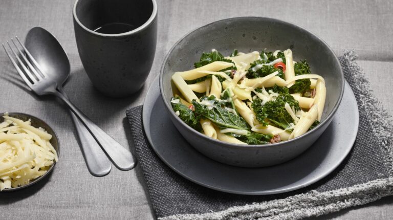 Consiglio: utilizzare la verza al posto del cavolo nero. Se non si ha a disposizione una padella sufficientemente grande, cuocere la pasta separatamente.