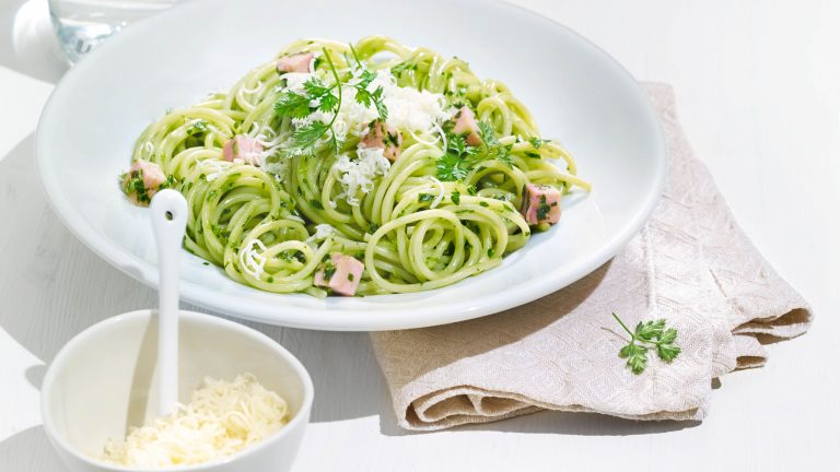 Servire gli spaghetti con il resto dell’Emmentaler DOP.