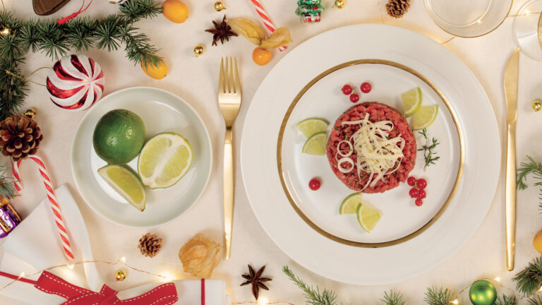 Appoggiare i riccioli di Emmentaler DOP sulla tartare. Decorare il piatto con ribes, spicchi di lime e timo.