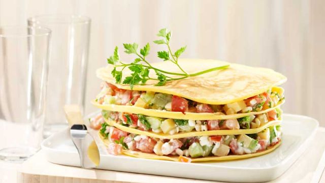 Utilizzando se necessario un anello per torte, stendere alternativamente un’omelette e uno strato di composto a base di verdure e formaggio. Servire calda.